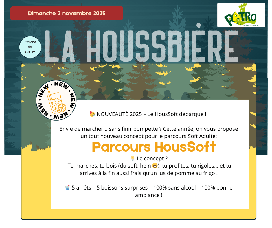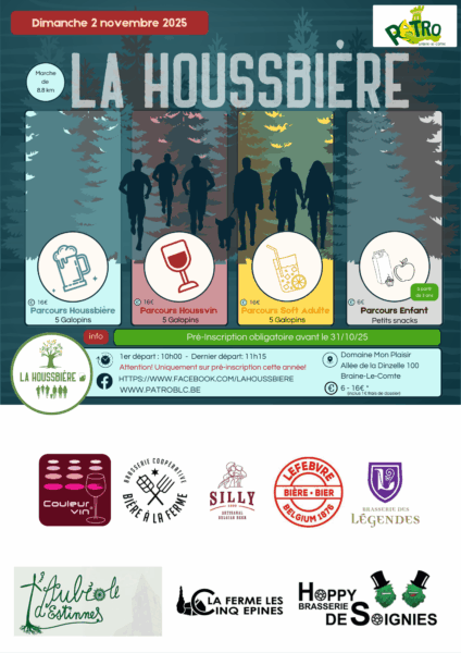 Rejoignez-nous pour une expérience unique alliant sport, convivialité et dégustations ! Venez vivre une aventure de 8,8 km de course à pied ou de marche à travers le magnifique bois de la Houssière. En chemin, vous aurez l’occasion de découvrir et savourer des bières artisanales locales, des vins raffinés et des softs originaux aux stands de dégustation.